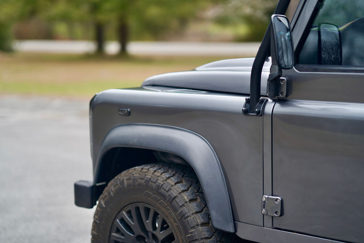 The distinctive four-door pickup body is finished in modern Corris Gray Metallic, striking a balance between contemporary sophistication and classic utility. A multi-point Safety Devices® external safety cage subtly nods to the vehicle’s rugged heritage, while black anodized Optimill® aluminum bonnet and windscreen hinges reinforce the subdued, purposeful aesthetic. Project Kahn® X-Lander grille treatment, black side intake and forced-air wing-top vents, and color-matched trim complete the exterior palette. Up front, twin LED running lamps are integrated into the bumper, while the North American–spec rear step bumper incorporates a rearview camera, 2-inch hitch receiver, and jacking and recovery points. A bed-mounted rear tire carrier rounds out the rear, offering both practicality and visual balance.