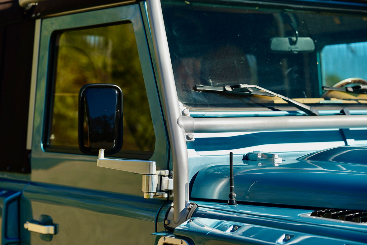 The body, sporting an agressive Project Kahn® widebody kit, was expertly finished in distinct Viking Blue Metallic and carefully reunited with the chassis once back from our in-house body and paint shop. A satin silver powder-coated 4-point roll cage protects precious human cargo and the tight-fitting, premium Chocolate soft top with roll-up/zip-out side and rear windows keeps the elements at bay when needed and can easily be removed when you want to feel closer to Mother Nature. “Osprey” monogrammed, LED-illuminated, billet aluminum exterior door handles, and billet aluminum door, bonnet, and windscreen hinges complement the color palette, as the front end was updated with a color-matched Project Kahn® grille and light surrounds, and side intake and forced-air wing top vents with silver accents. The front bumper is home to twin LED driving lamps and the tubular rear step bumper accommodates the rearview camera, a 2" hitch receiver, and jacking/recovery points. A heavy-duty, swing-away rear tire carrier neatly finishes the tail end.