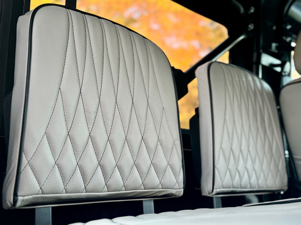 Satin black powder-coated "Fire & Ice"-style tubular side steps make entering and exiting the passenger cabin easy. Inside, you'll find a modern-style dash that ensures excellent heating and air conditioning, providing year-round comfort for the occupants. The well-appointed interior is complete with durable Exmoor Trim® Black Rack & ½ Leather upholstered heated front sport seats with contrasting white stitching. Additionally, the four side-facing rear seats can easily be stowed away when not in use, offering ultimate flexibility — seating for additional friends and family or creating true utilitarian cargo space, with over 55 cubic feet available when folded.
